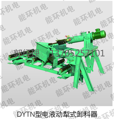 DYNT型单双侧耐磨式犁式卸料器,是以电液推杆为动力源,工作时通过推杆伸出驱动杆,带动框架前进完成机头下落,并支撑起平托辊组,使胶带工作面平直,机头下沿与胶带面贴合紧密,将胶带上物料写入斗中,送到需要场所,卸料完毕后,启动电液推杆而缩回驱动杆,带动框架后退,犁头上抬,可变托辊组由平行变回槽形,让物料平稳通过。